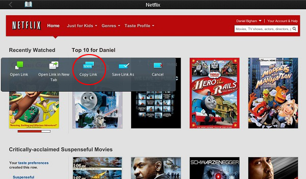 Once you have located a movie to watch, hold your finger down on the movie thumbnail. Ideally, a popup menu will appear. However, what typically happens is that the movie will appear to be selected while your finger is held down, but will then deselect after a couple of seconds. If this happens, lift your finger and then touch and hold your finger on the movie a second time, or possibly a third time. Eventually you should see a popup menu allowing you to choose "Copy Link". See the following screenshot for what to look for. (Future versions of the app will likely solve this disappearing popup menu issue by simply allowing you to touch the movie, but this requires RIM to build in support for embedding a web browser in apps built with their Native Development Kit) Sometimes if you hold your finger down on a movie, the web browser will interpet that as a "click" and will open a page that tells you that playback isn't supported on your device. If that happens, simply click the browser's back button and try again.