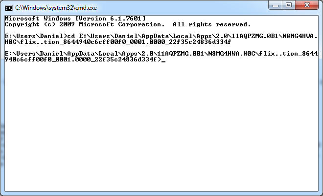 - Use the address bar at the top of the resulting Windows Explorer window. Find a blank spot and click, then right click the selected text and select "Copy". The folder should look something like: C:\Users\Daniel\AppData\Local\Apps\2.0\11AQPZMG.0B1\N8MG4HWA.H0C\flix..tion_8644940c6cff00f0_0001.0000_22f35c24836d334f